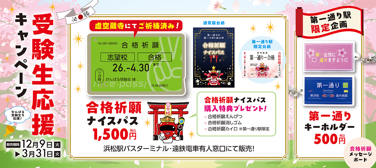 「第一通り駅」は「『第一』志望に『通る』駅」という、縁起の良い駅名にあやかり、「合格祈願ナイスパス」の販売期間中、受験生応援キャンペーンを実施いたします。