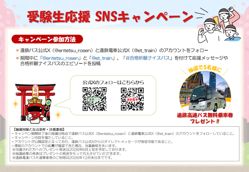 受験生応援SNSキャンペーンにご参加いただいた方の中から抽選で5名様に遠鉄高速バス片道乗車券をプレゼント!